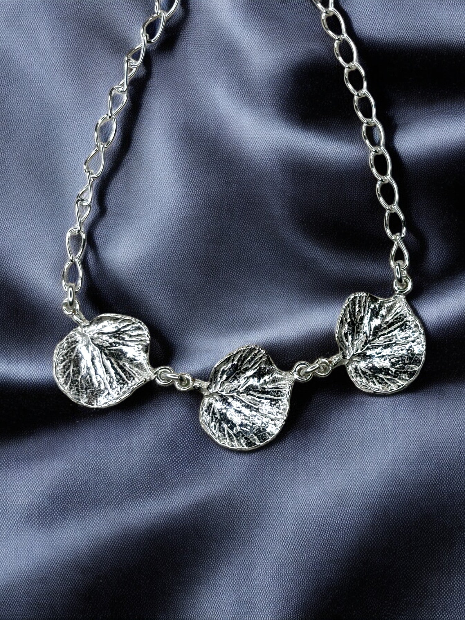Kolmen samankokoisen kauniin lehmuslehden kaulakoru.